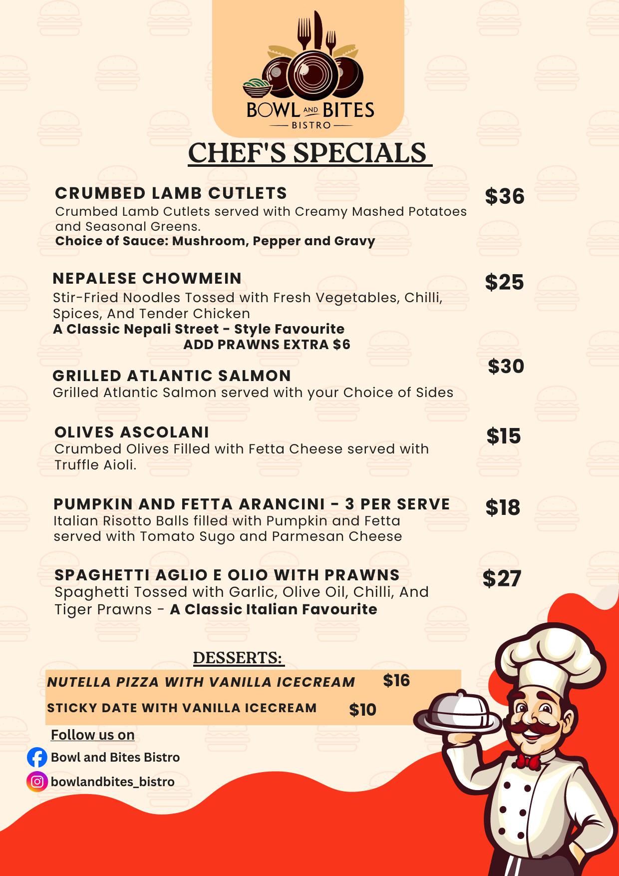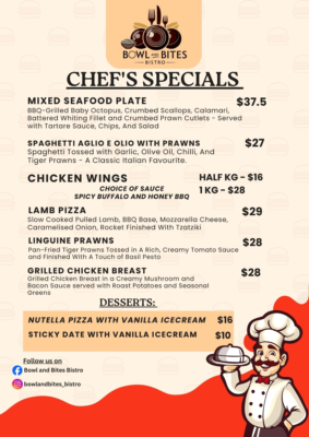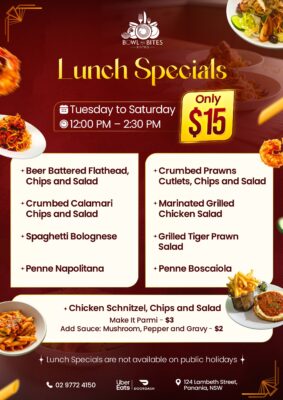 Dining Bowl and Bites Bistro Bowl and Bites is now open for trade Trading hours are: Lunch: 12pm – 2:30pm Dinner: 5:30pm – 9pm Menu View Gallery View Gallery Functions Menu View Gallery View Gallery Bowl and Bites Specials