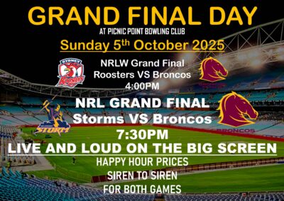 Bookings are essential and you must pick your main meal while paying for your booking. Call the club on 9773 5734 or come down to the club and speak to the bar staff or Pam.