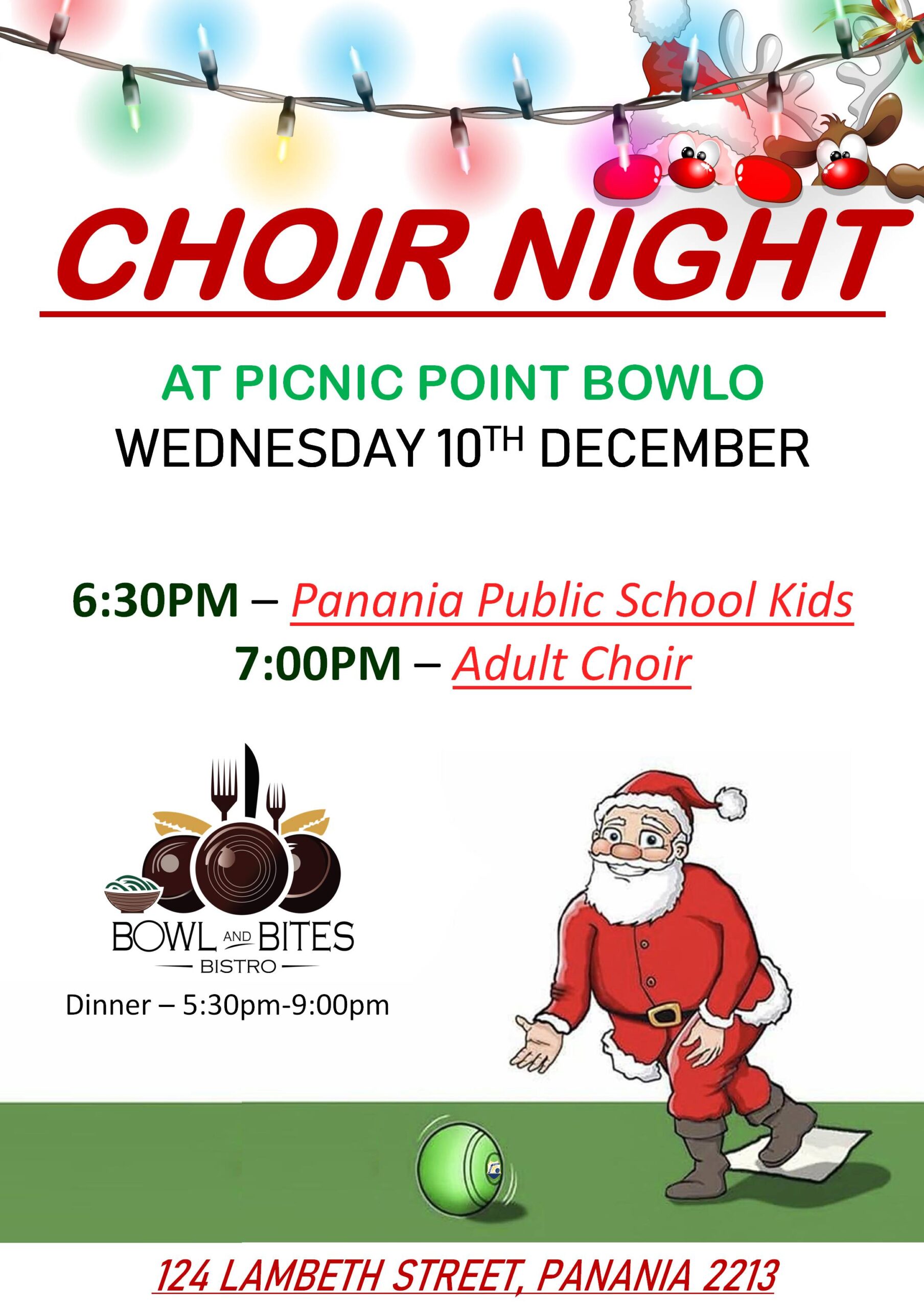 Christmas Carols at the Bowlo Come down to the club on Wednesday 10th December Bowl and Bites Bitsro Lunch: 12:00pm-2:30pm Dinner: 5:30pm-9:00pm Choir starts singing from 6:30pm Kids Choir up first and Adults Choir at 7:00pm