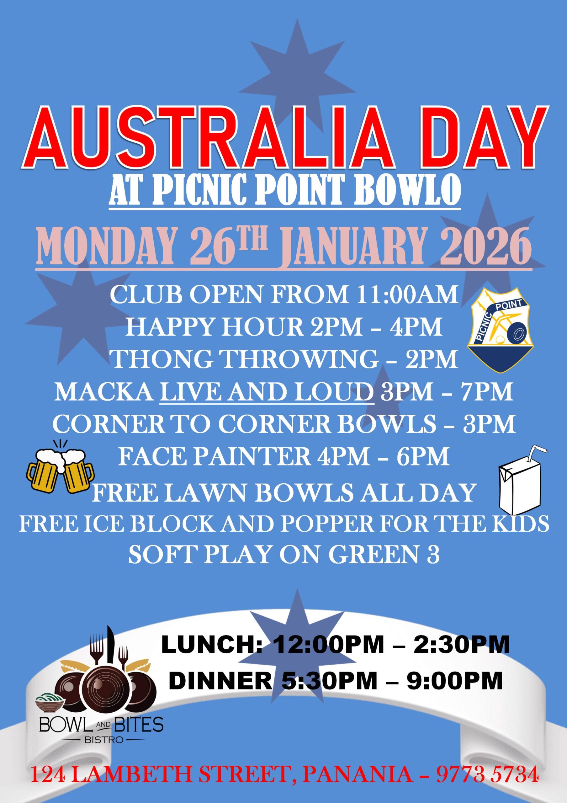 π¦πΊ Australia Day at Picnic Point Bowlo π¦πΊ π Monday 26th January 2026 π 124 Lambeth Street, Panania π 9773 5734