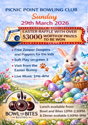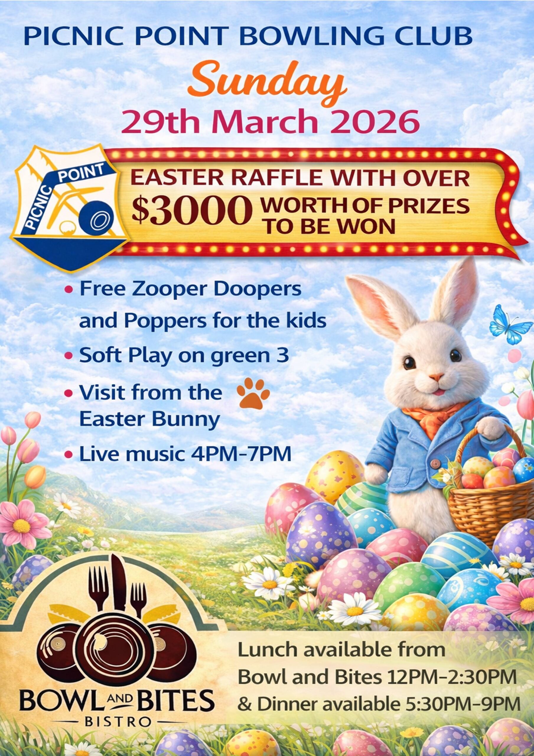 Join us at Picnic Point Bowling Club on Sunday 29th March 2026 for a fantastic Easter celebration for the whole family!